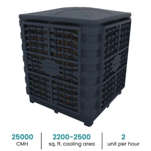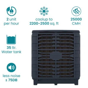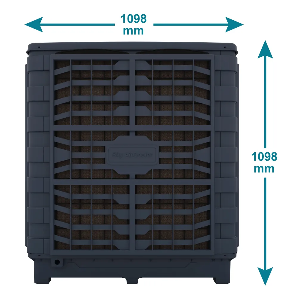The Jupiter Top/Bottom Discharge Air Cooler from Sky Air Cooler is built to provide powerful and efficient cooling for large industrial and commercial spaces. With an air delivery rate of up to 22,000 m³/hr, it can effectively cool areas as large as 2200 – 2500 sq. ft. The cooler is equipped with a high-quality honeycomb cooling pad, ensuring superior cooling performance and enhanced efficiency. Its fully automatic control panel allows for easy adjustments to speed and cooling settings, making it customizable to meet specific cooling needs. Built with robust and durable materials, the Jupiter Air Cooler is designed for long-lasting service, offering a reliable, energy-efficient, and eco-friendly solution for all your cooling requirements. Reach out to us today for pricing and to learn how the Jupiter Top/Bottom Discharge Air Cooler can transform your space.