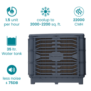 The Pluto Evaporative Air Cooler from Sky Air Cooler is designed for powerful and efficient cooling of large spaces. With a large air delivery rate of up to 22,000 m3/hr, it can cool an area of up to 2000 – 2200 sq. ft. The cooler features a high-quality honeycomb cooling pad that ensures maximum cooling performance. It also has a fully automatic control panel that allows you to adjust the speed and cooling settings as per your requirements. The Pluto air cooler has a durable and sturdy body that is made of high-quality materials, making it a reliable and long-lasting cooling solution for industrial and commercial applications. You can contact us know evaporative air cooler price.