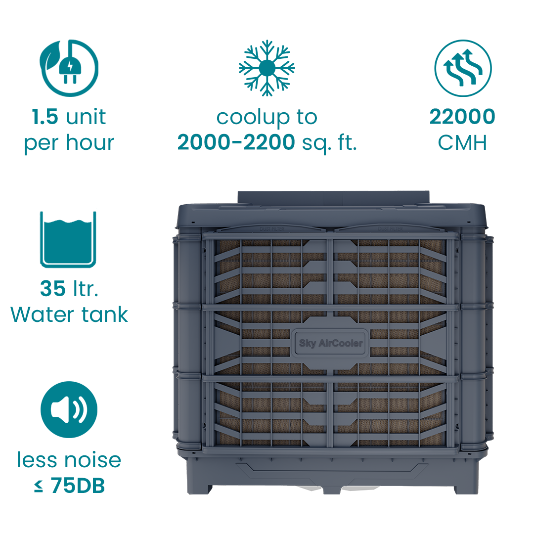 The Pluto Top Discharge Air Cooler from Sky Air Cooler is the ideal choice for powerful and efficient cooling in large industrial or commercial spaces. As a trusted Pluto Top Discharge Air Cooler Manufacturer, we offer a model with a remarkable air delivery rate of up to 22,000 m3/hr, capable of cooling areas up to 2,000 – 2200 sq. ft. The cooler is equipped with high-quality honeycomb cooling pads that enhance its cooling efficiency. Additionally, it features a fully automatic control panel, allowing you to adjust cooling settings and fan speeds to meet your specific needs. Built with a durable and robust body, the Pluto air cooler is designed for long-lasting performance in demanding environments. Whether for warehouses, factories, or large offices, it serves as a reliable, energy-efficient solution. Contact us today to learn more about the evaporative air cooler price and how it can benefit your business.