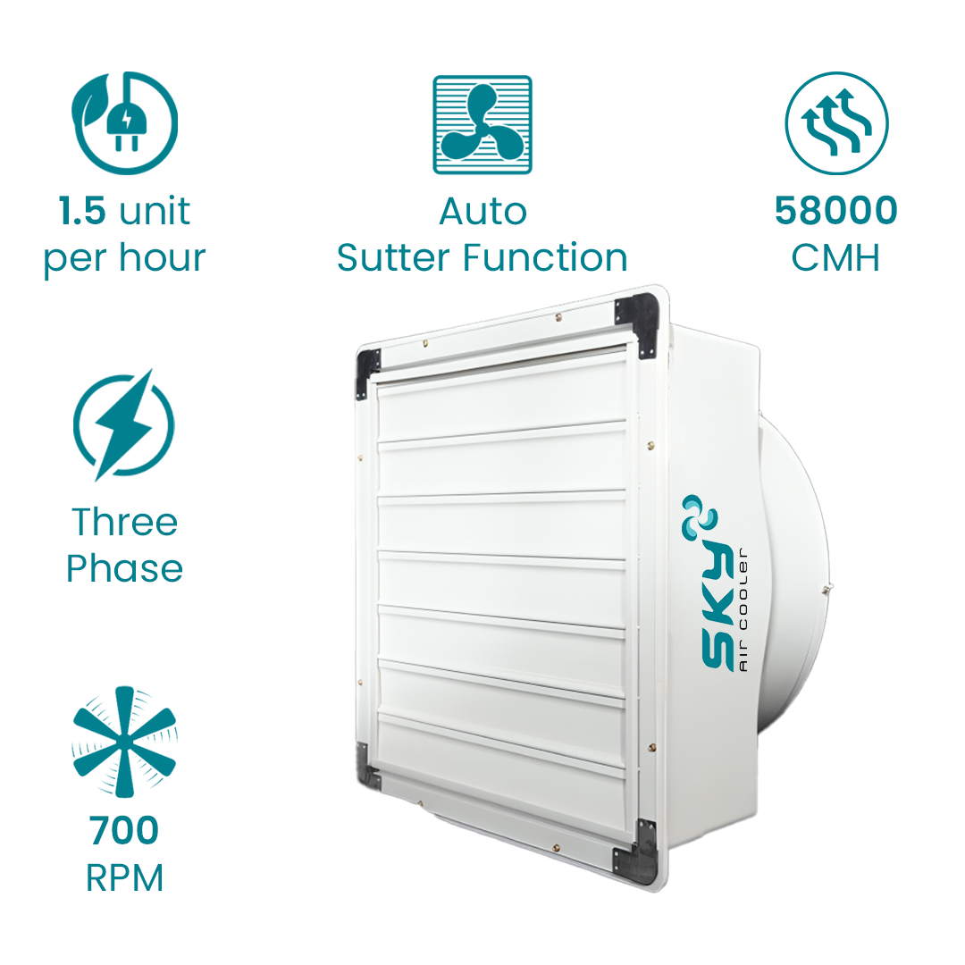 Sky Air Cooler, a leading Exhaust Fan manufacturer, offers high-quality ventilation solutions with the advanced design of the Skyex 1460 Exhaust Fan. This fan, with a capacity of 58,000 CMH and powered by a 1.5 kW motor, operates at 415V/50Hz, making it highly efficient in maintaining airflow. Designed with durable materials and cutting-edge technology, the Skyex 1460 Exhaust Fan ensures optimal air circulation, reducing heat build-up in industrial and commercial spaces. It helps improve air quality by eliminating hot air and pollutants, creating a more comfortable and healthier environment. The energy-efficient operation ensures that businesses benefit from reduced energy costs without compromising on performance. With a sleek and modern look, it is the ideal choice for those seeking an effective, eco-friendly, and low-maintenance solution for industrial ventilation needs. Sky Air Cooler takes pride in offering a product that not only meets industry standards but also delivers the best in performance, efficiency, and durability for various applications.